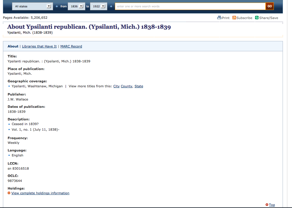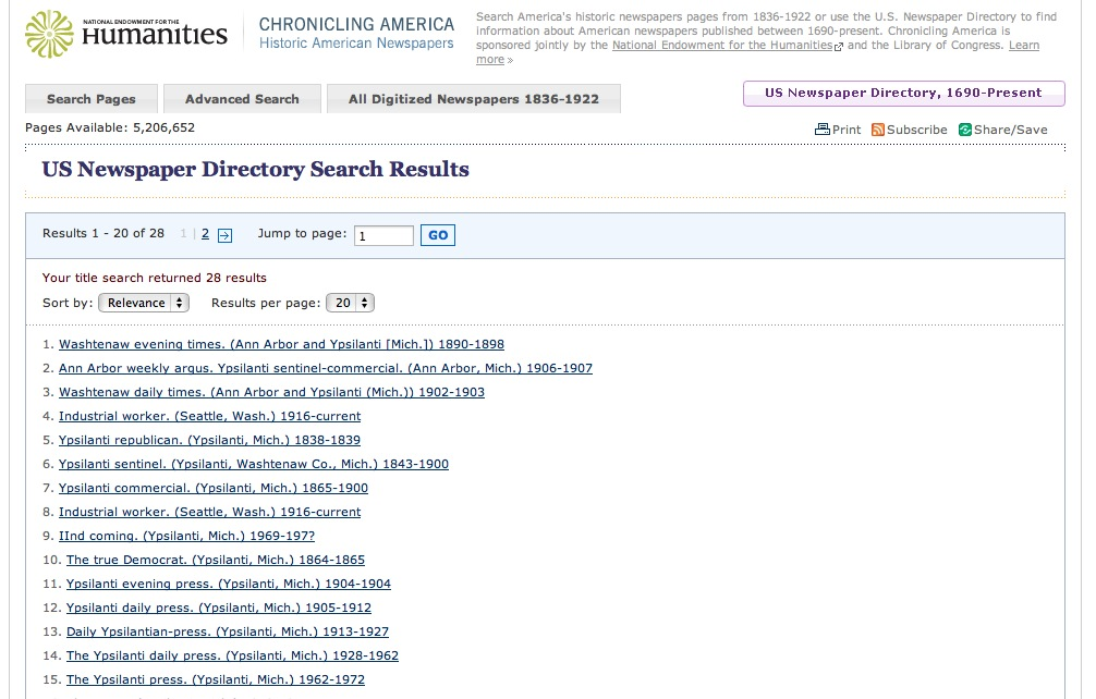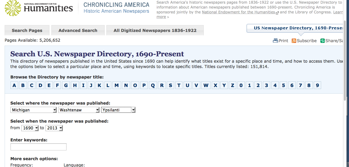 - Here is how I search to see all the newspapers published in Ypsilanti, Michigan. Notice I am searching the DIRECTORY of newspapers published, not the digitial images.